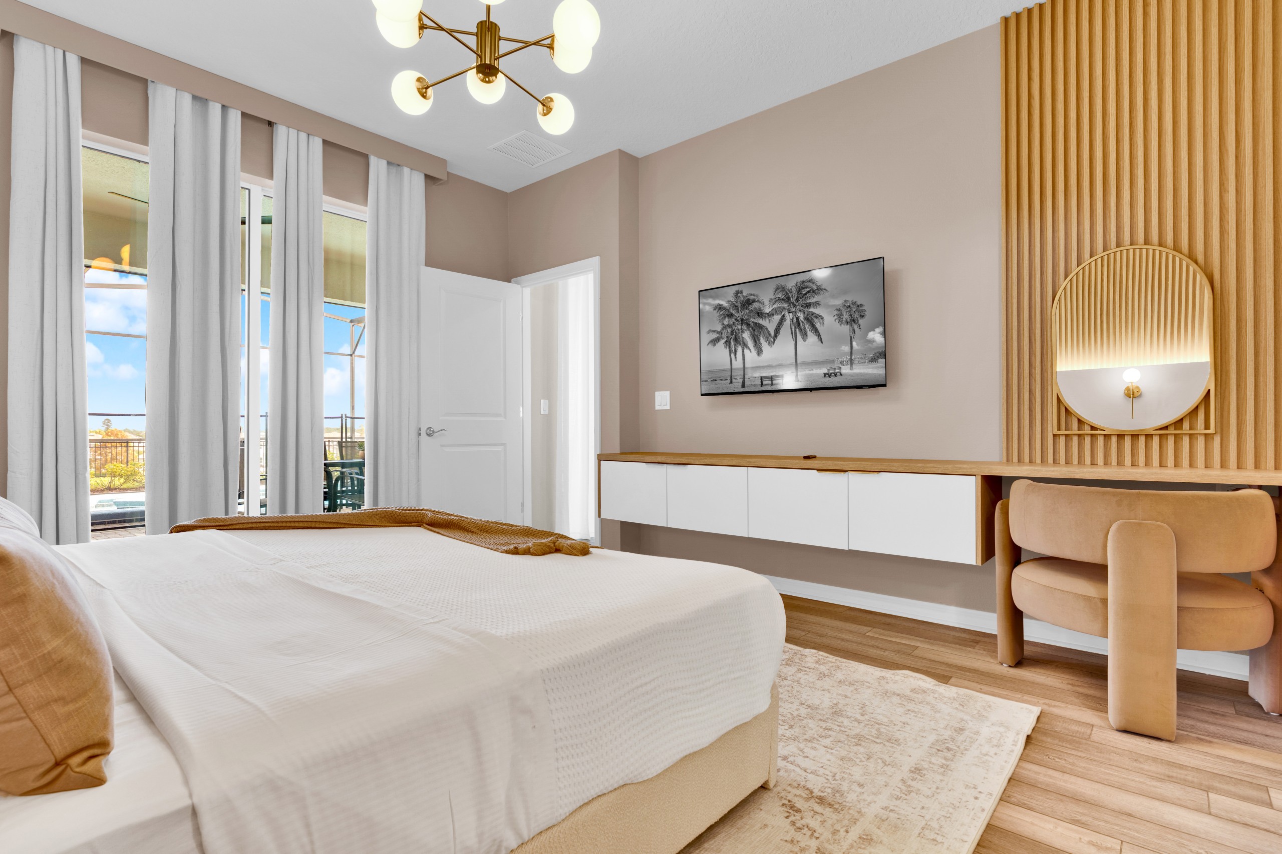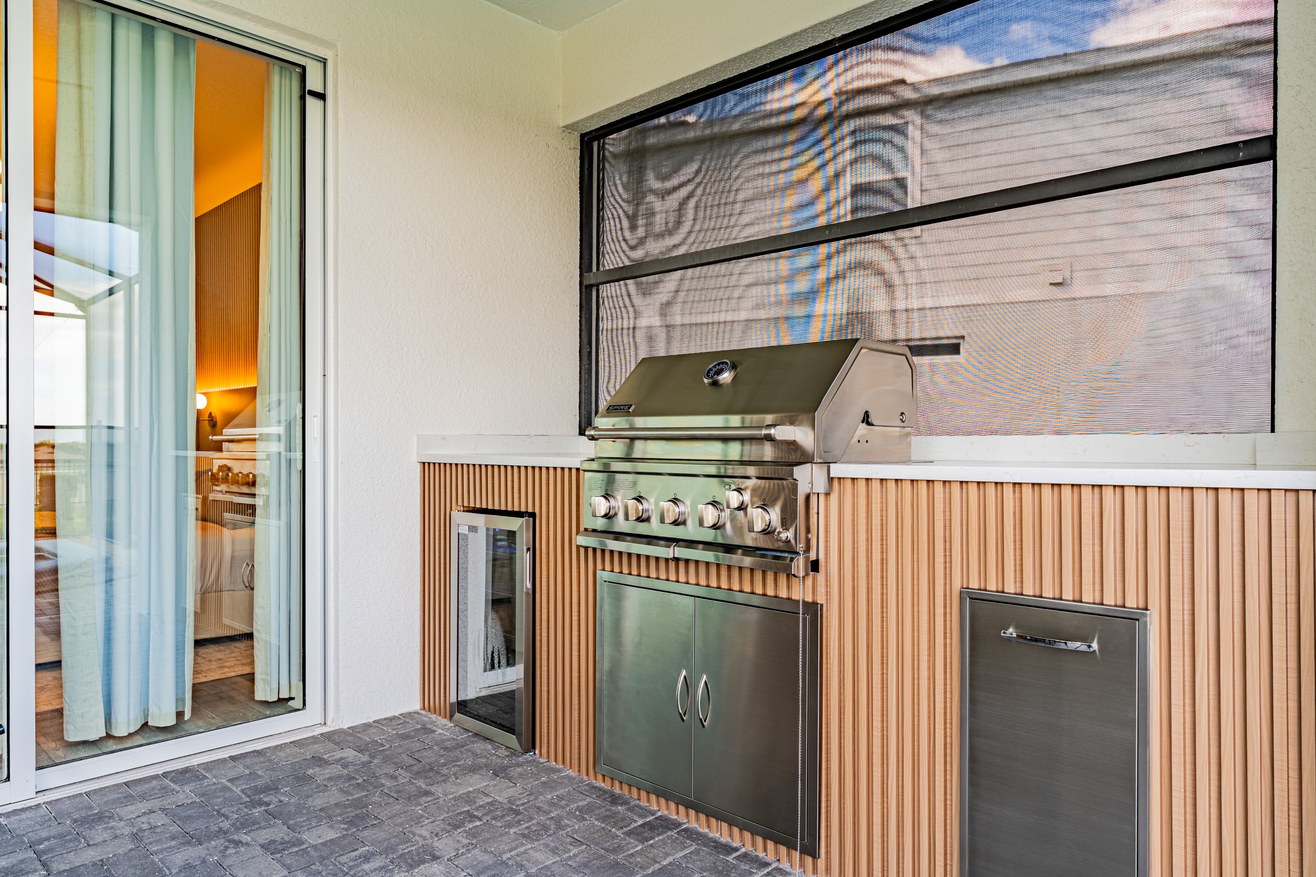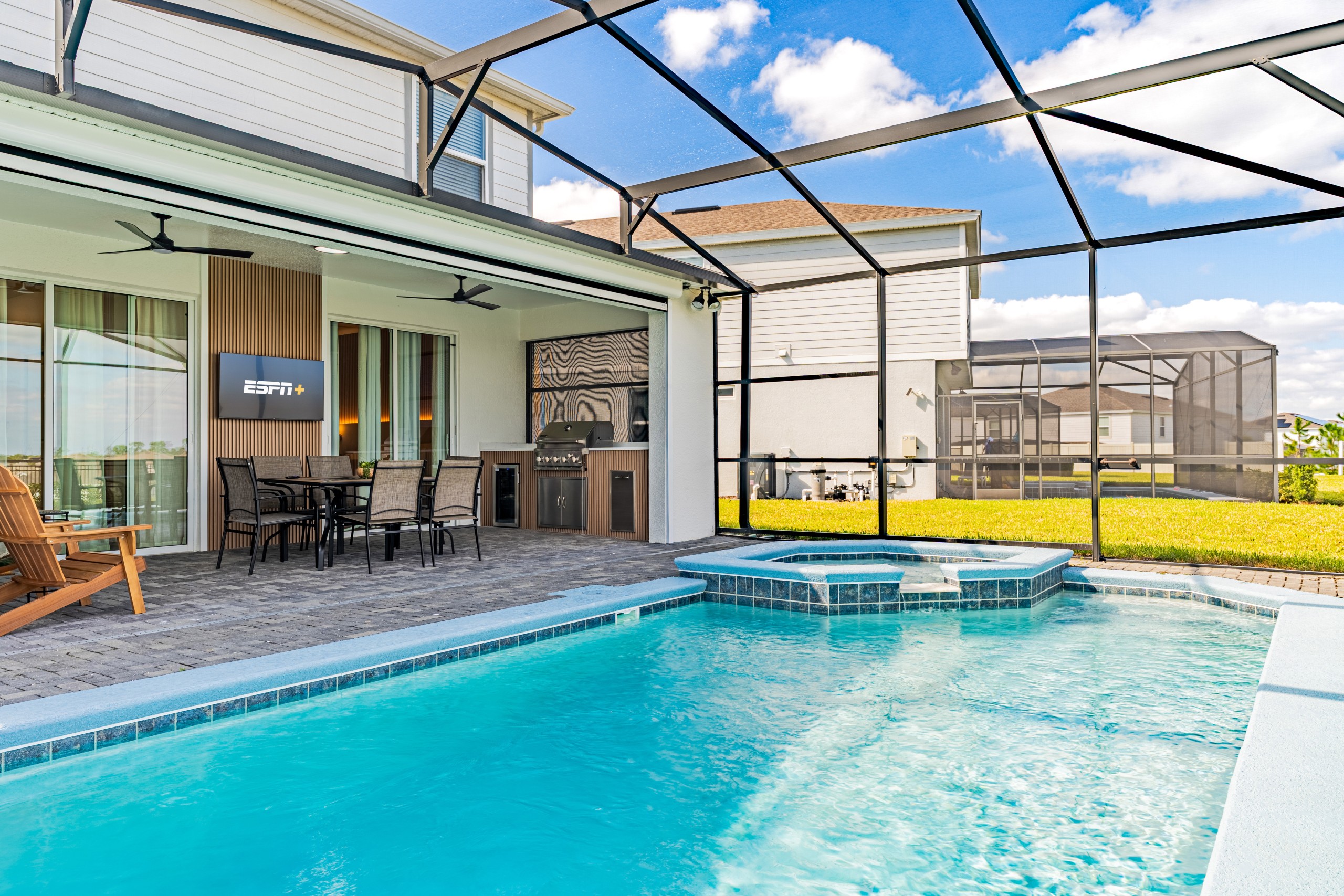 • Área externa privativa com piscina e spa, Smart TV Onn Roku de 50”, cozinha de verão e tela retrátil motorizada, garantindo conforto e privacidade.