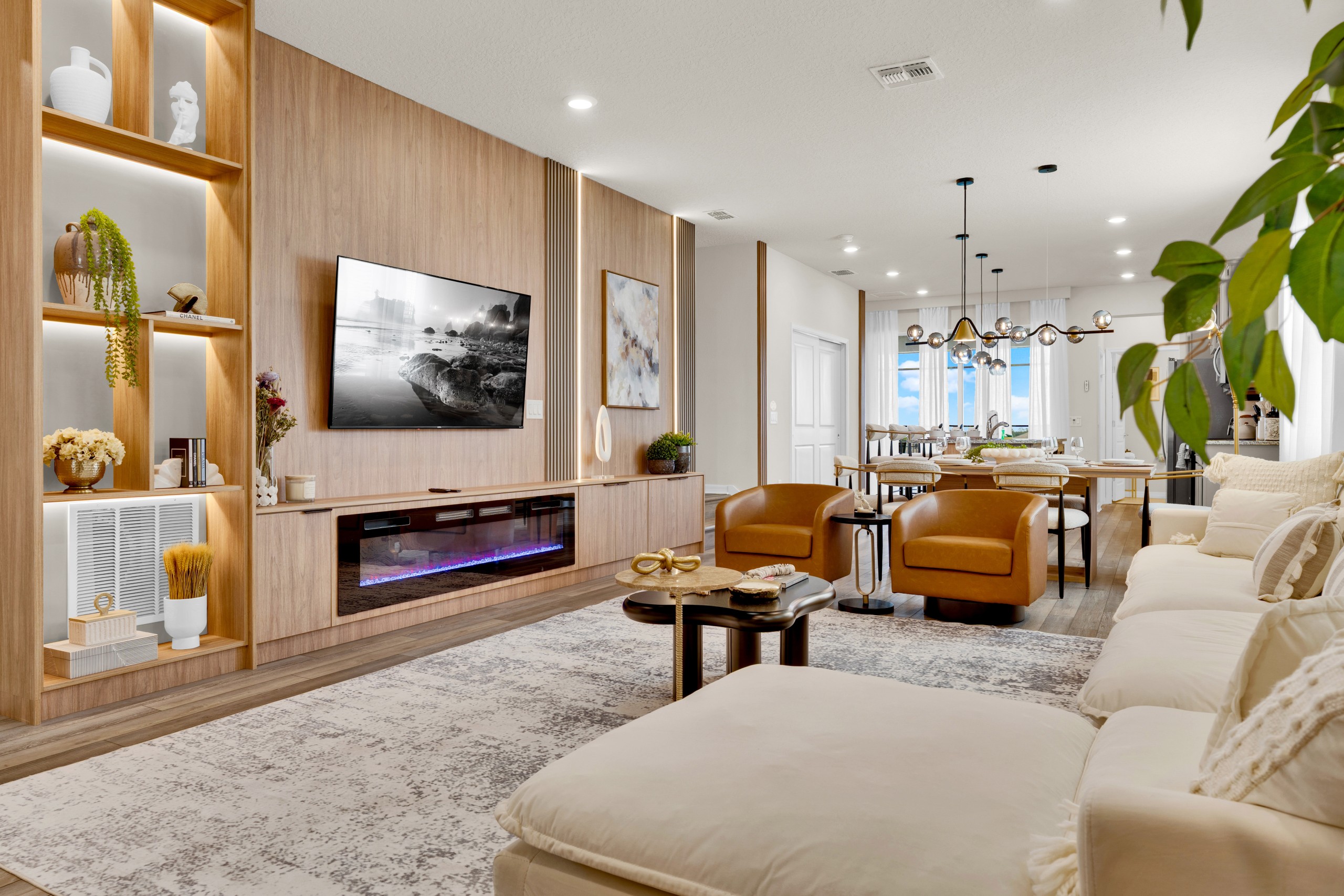 • Sala de estar com Smart TV Onn Roku de 65” e lareira elétrica, perfeita para relaxar após um dia de parques.
