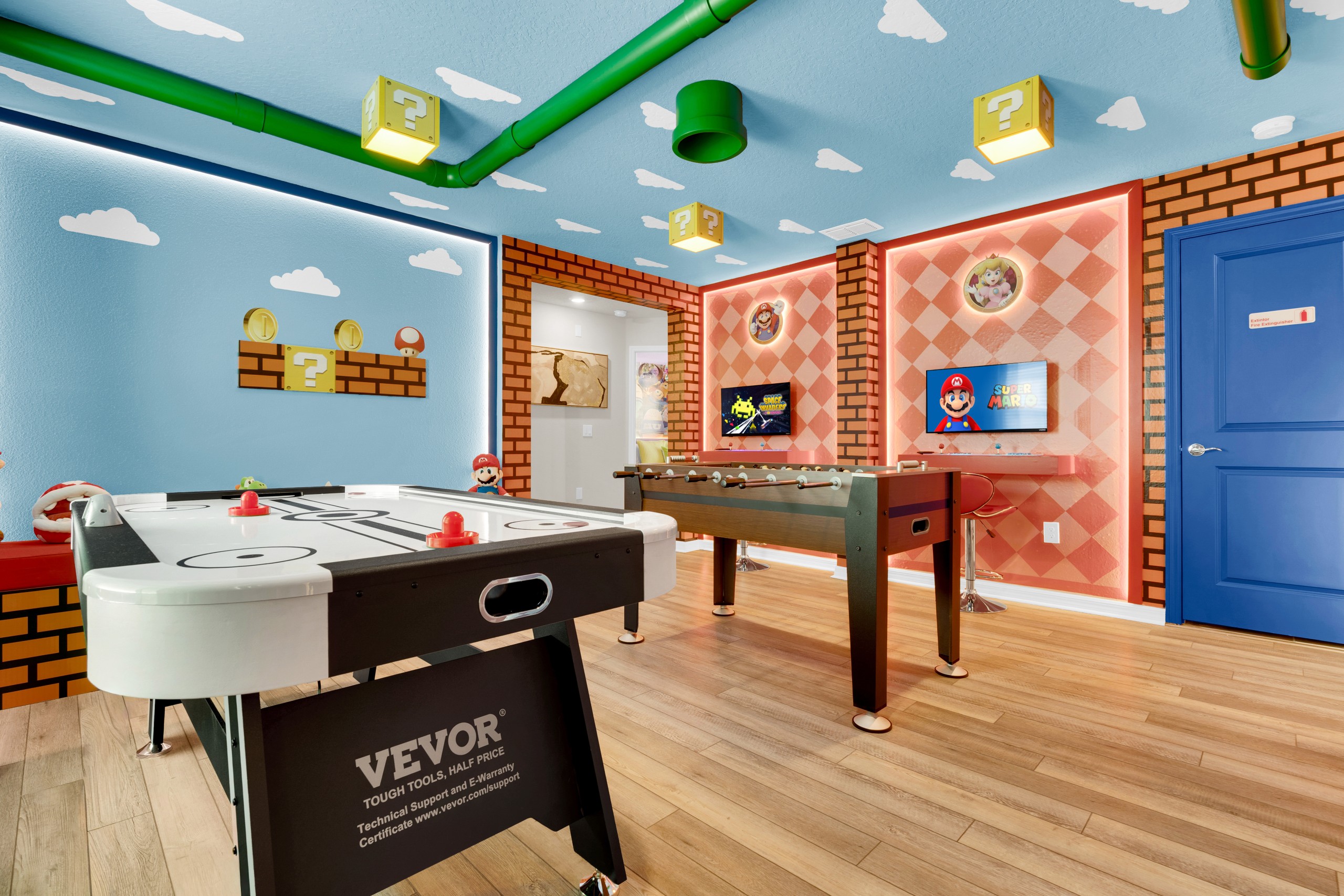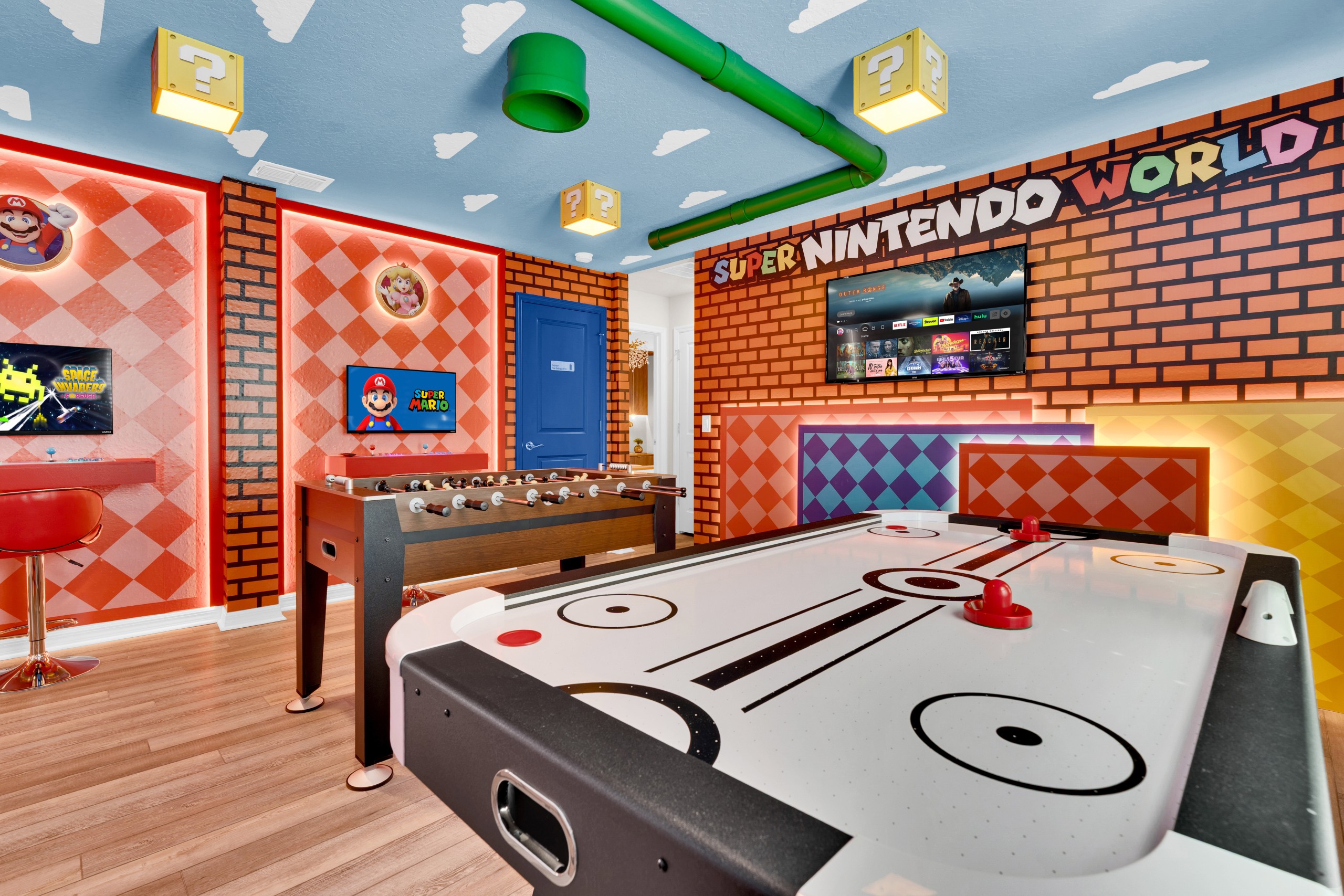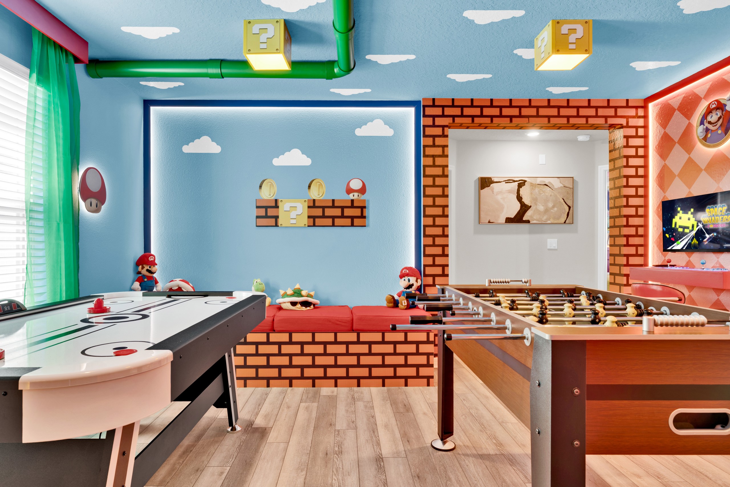 • Sala de jogos épica, com pebolim, air hockey e fliperamas clássicos — diversão para todas as idades! O ambiente ainda conta com uma Smart TV Onn Roku de 50” e duas TVs Vizio de 32”.