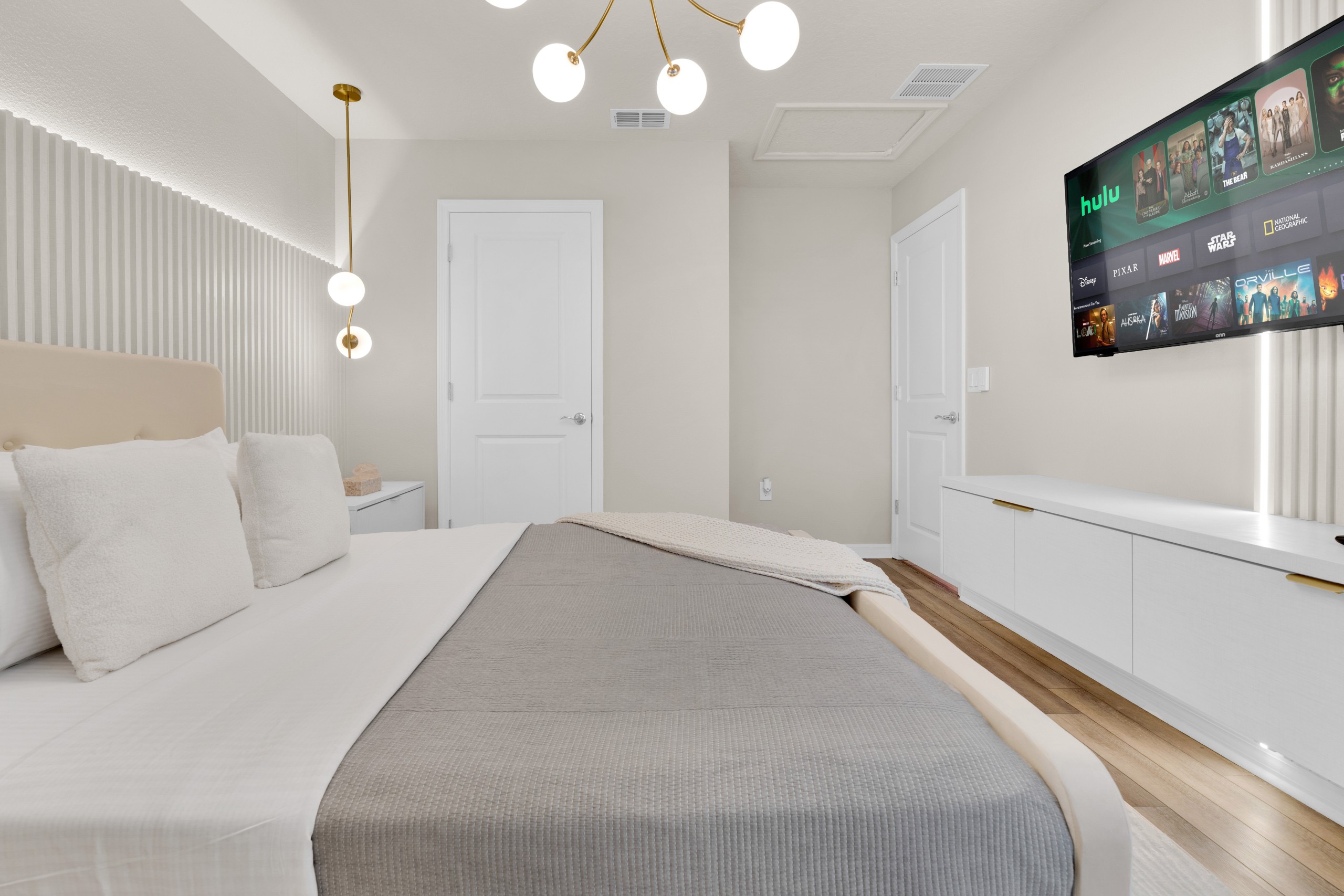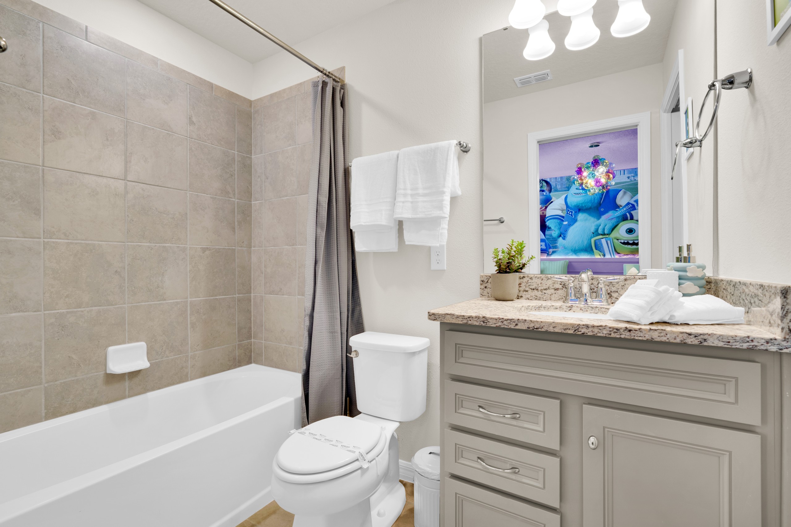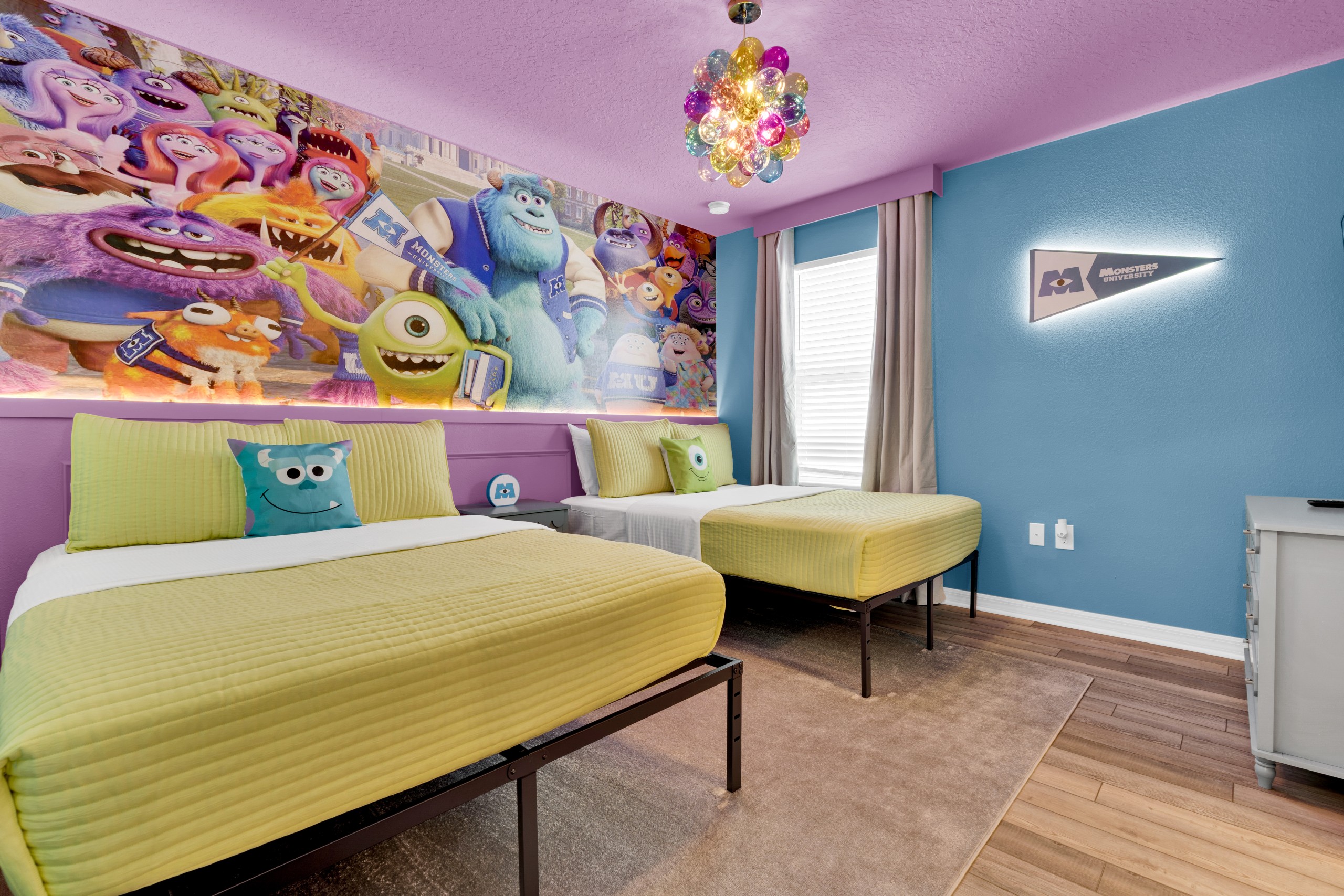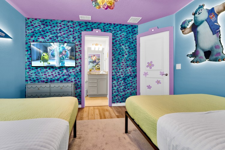 • Suíte temática Monstros S.A. com duas camas de casal (Full) e Smart TV Onn Roku de 50” — diversão garantida para os pequenos!