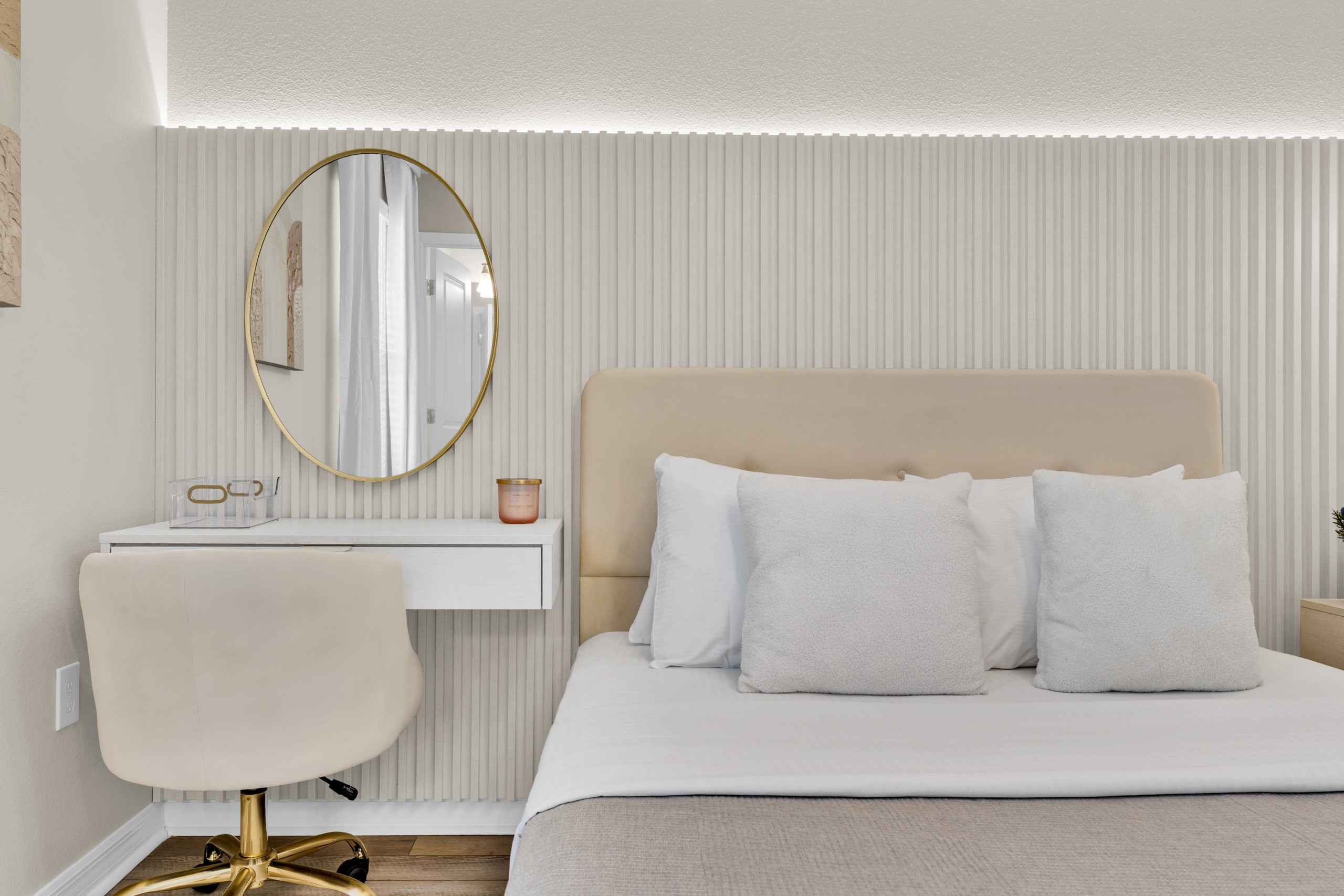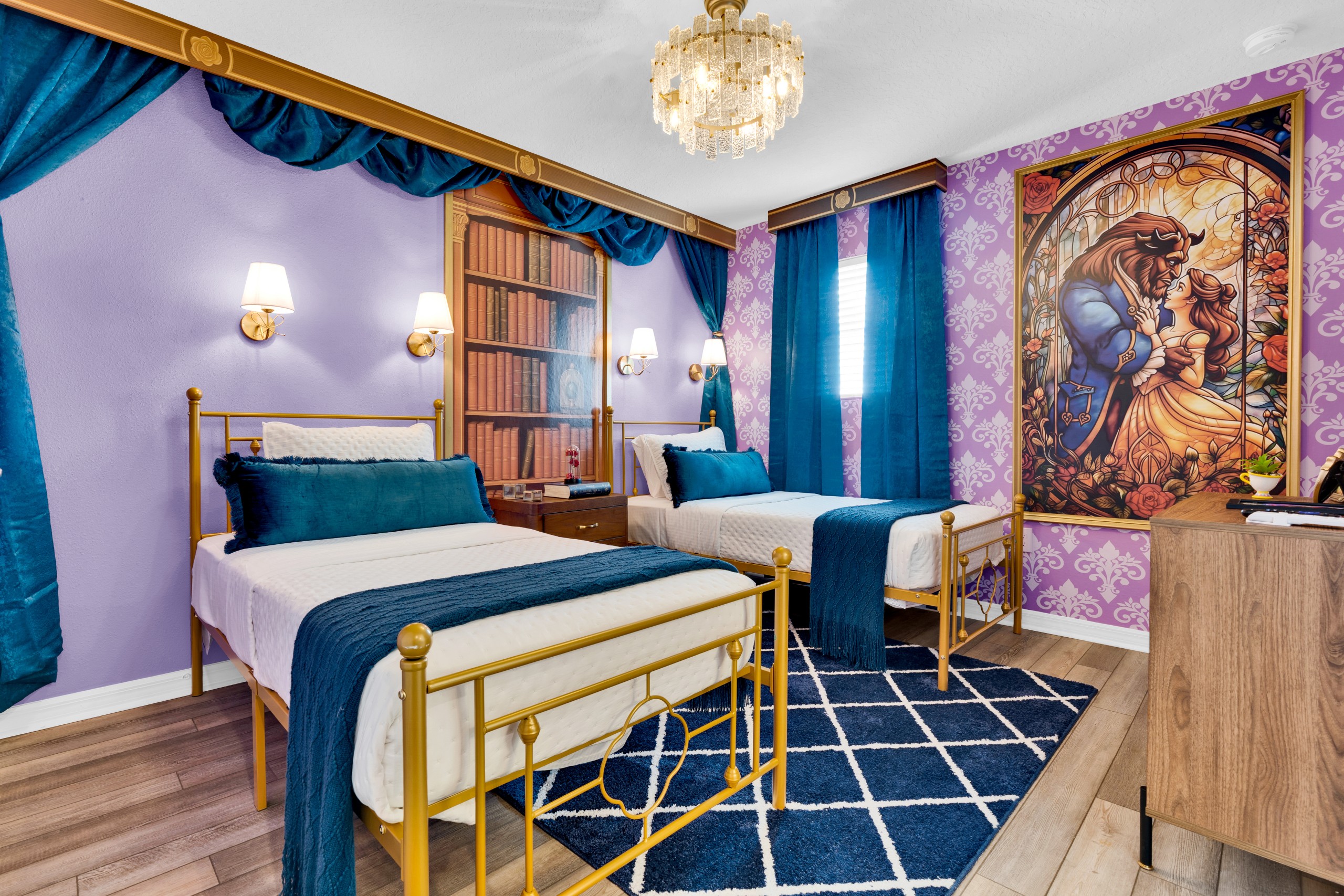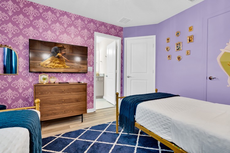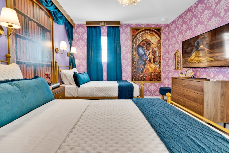 • Suíte temática A Bela e a Fera com duas camas de solteiro (Twin) e Smart TV Onn Roku de 50” — um verdadeiro quarto de conto de fadas.