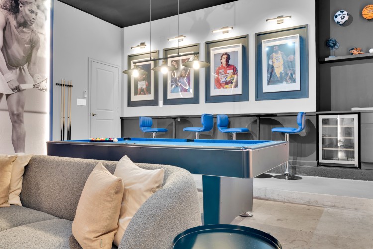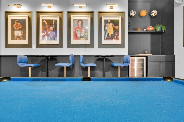 • Sala de jogos temática com mesa de bilhar, PS5, fliperamas e frigobar.