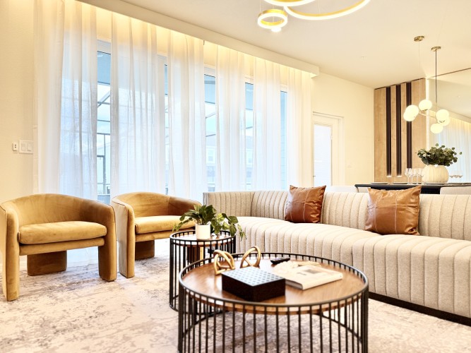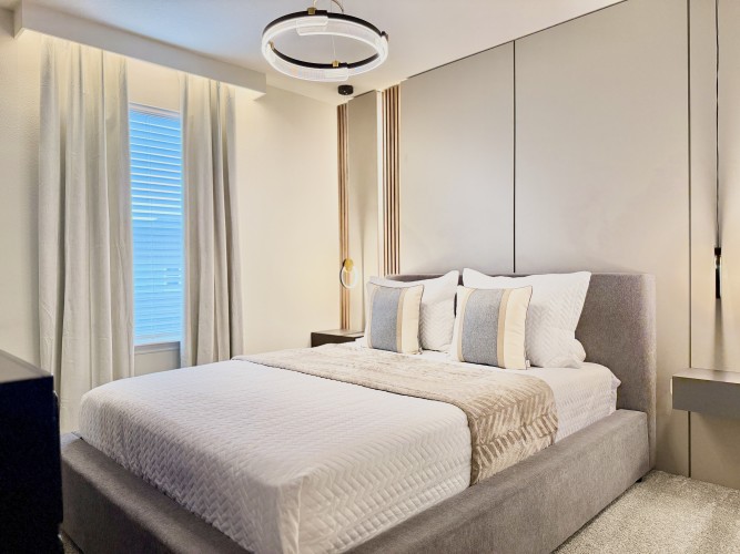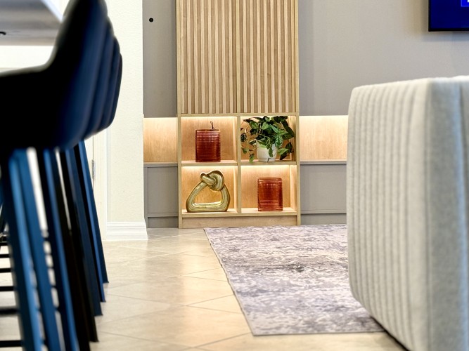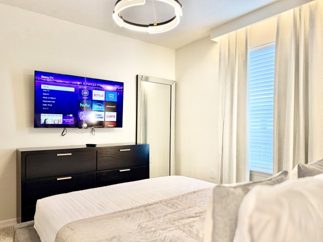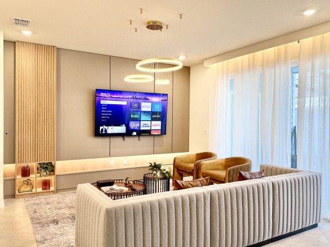 • Ampla sala de estar com Smart TV Roku 75”, perfeita para entretenimento;