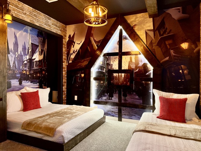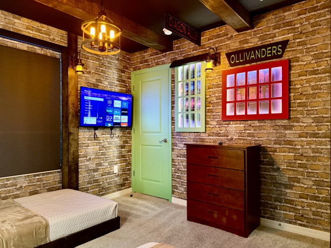 • Quarto temático de Harry Potter com uma cama de casal padrão (Full) e uma de solteiro e Smart TV Roku 43”;
