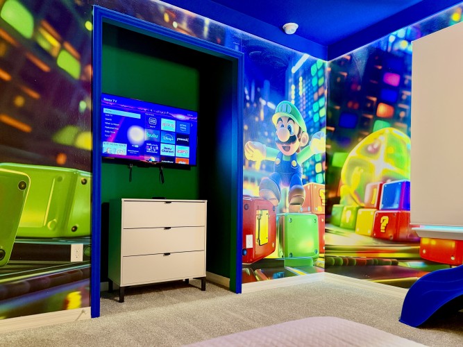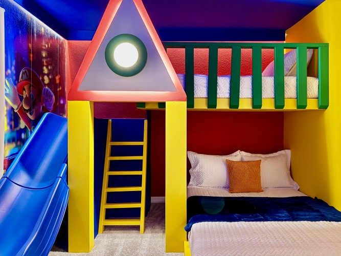• Quarto temático de Super Mario com beliche, sendo uma cama de casal padrão (Full) e uma de solteiro, escorregador e Smart TV Roku 43”, perfeito para crianças;