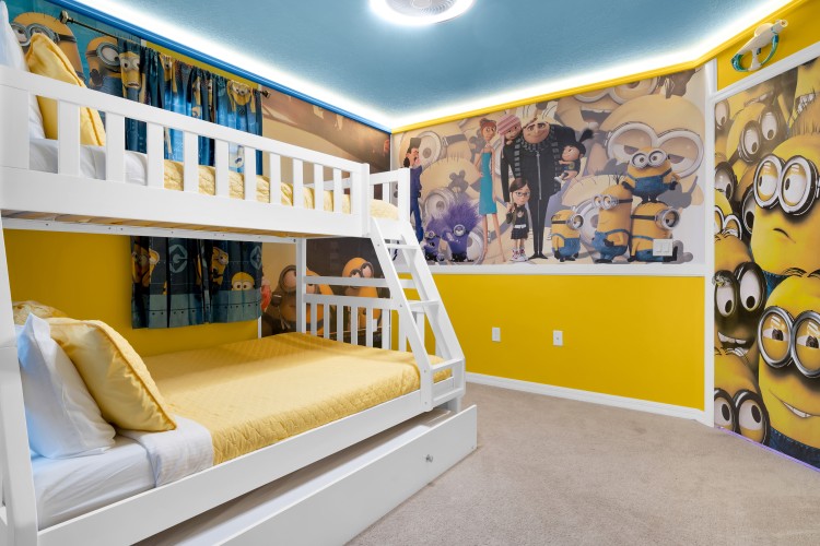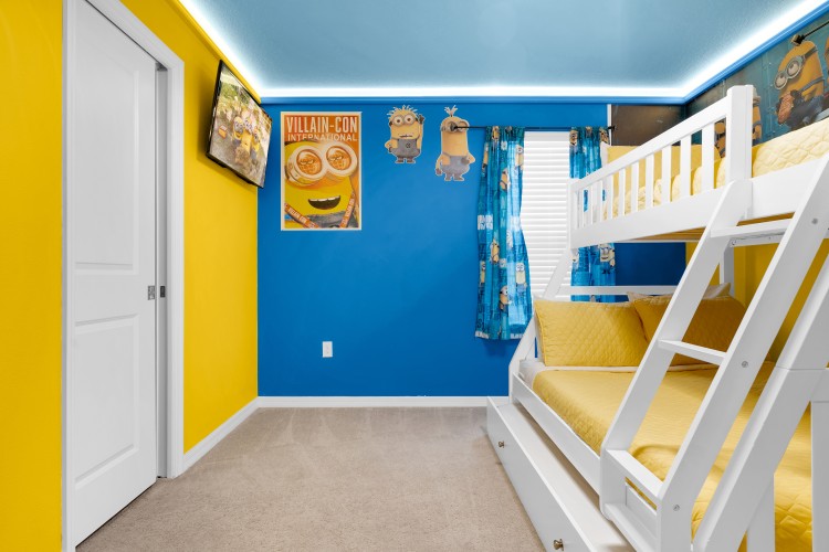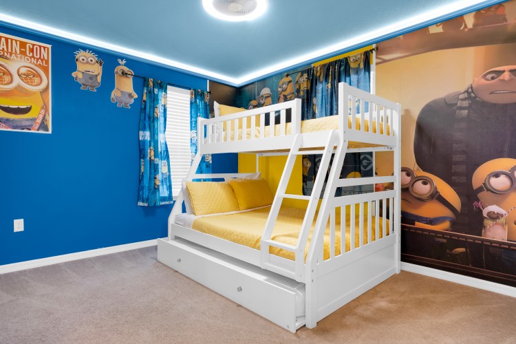 • 1 Suíte com beliche contendo 1 colchão de casal (full) e 2 de solteiro (twin), além de Smart TV de 40” (tema Minions)