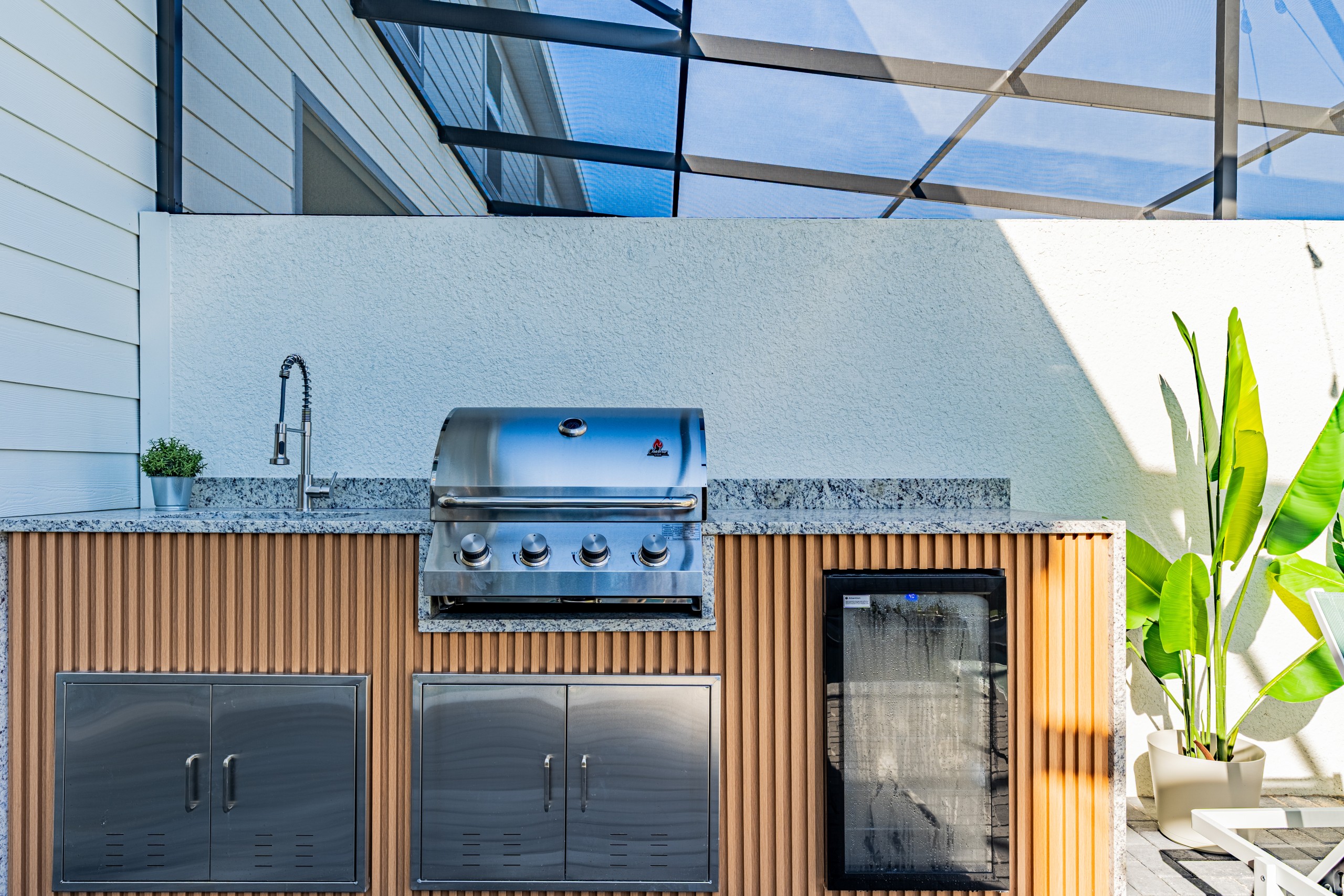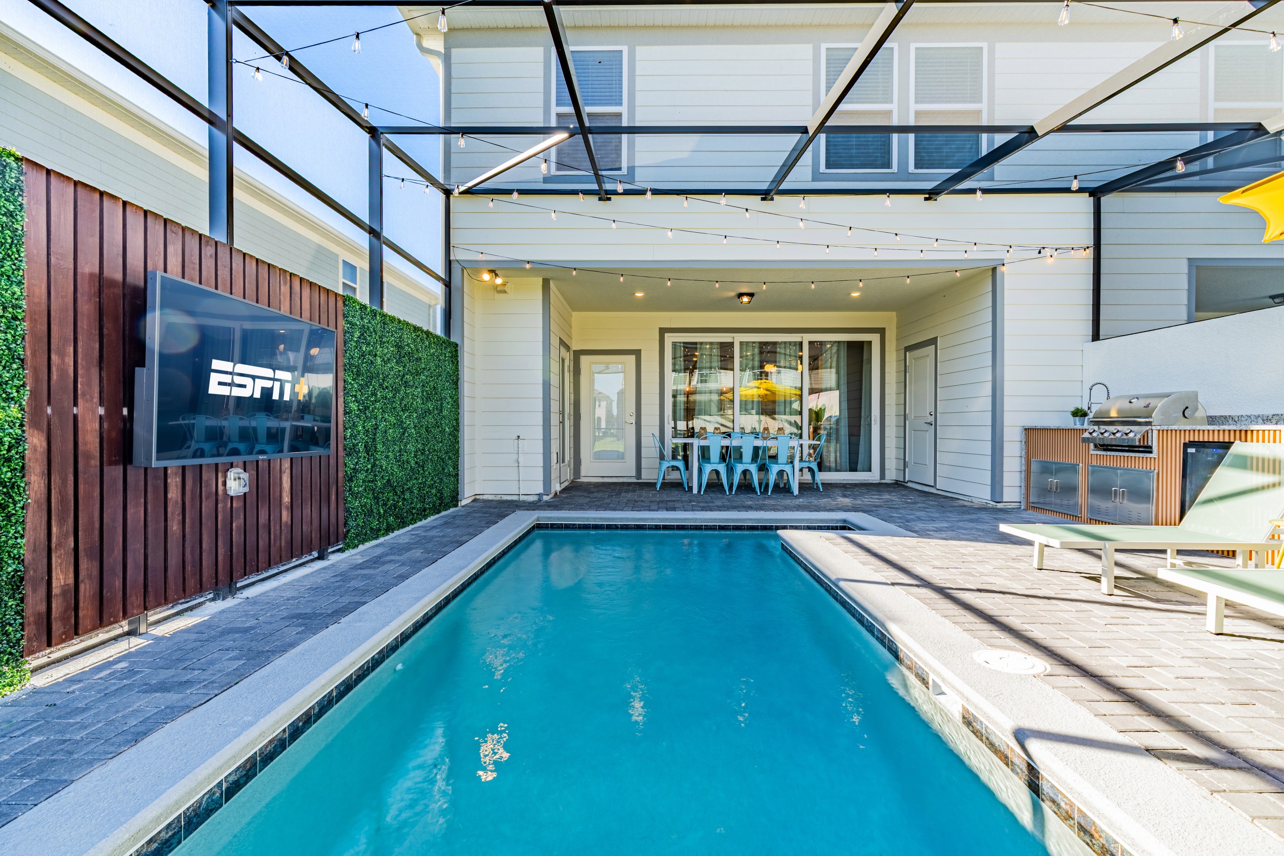 • Área de lazer privativa com summer kitchen, churrasqueira a gás, frigobar, piscina e TV externa Sylvox de 65”