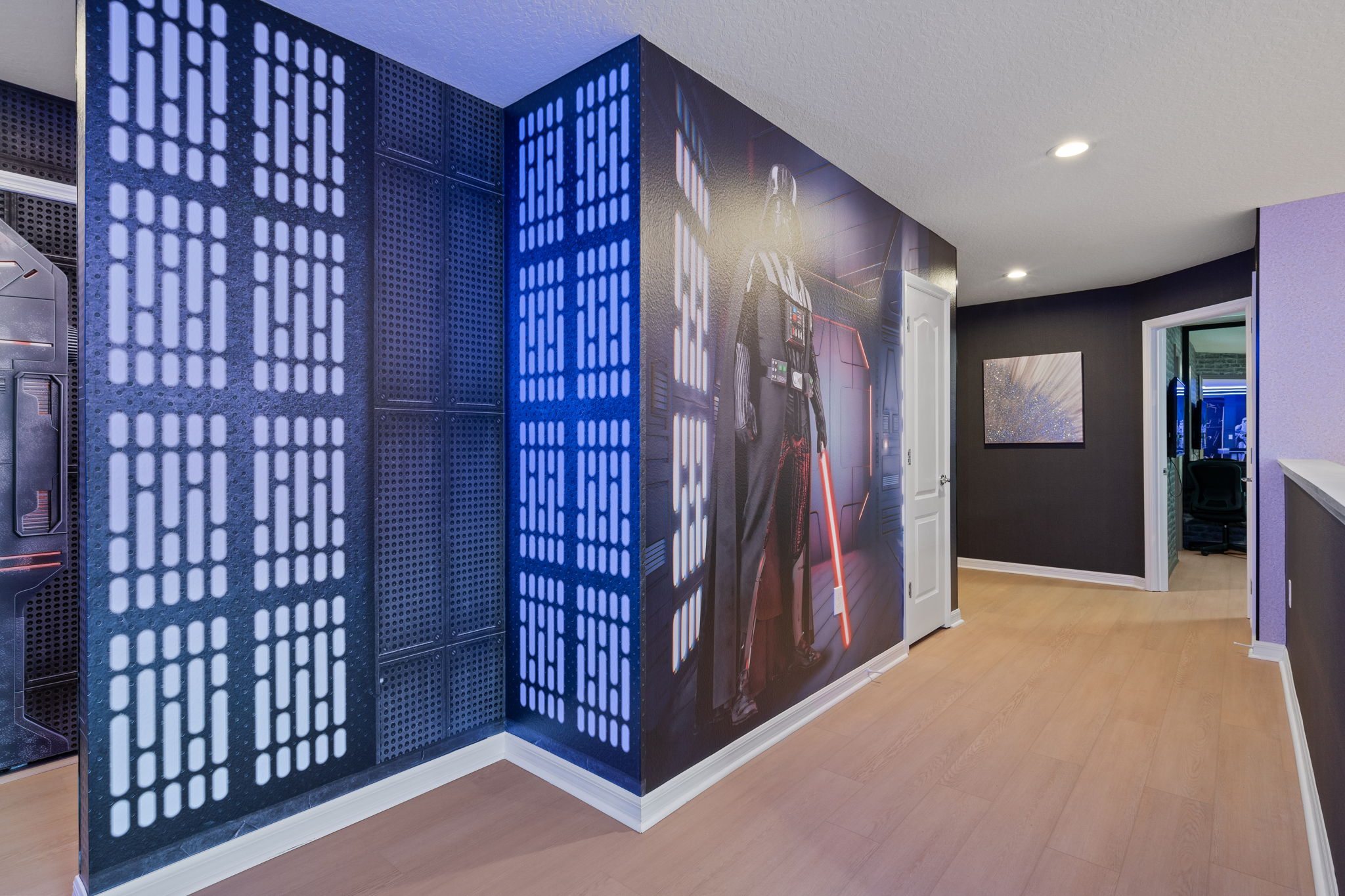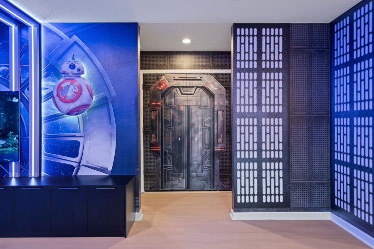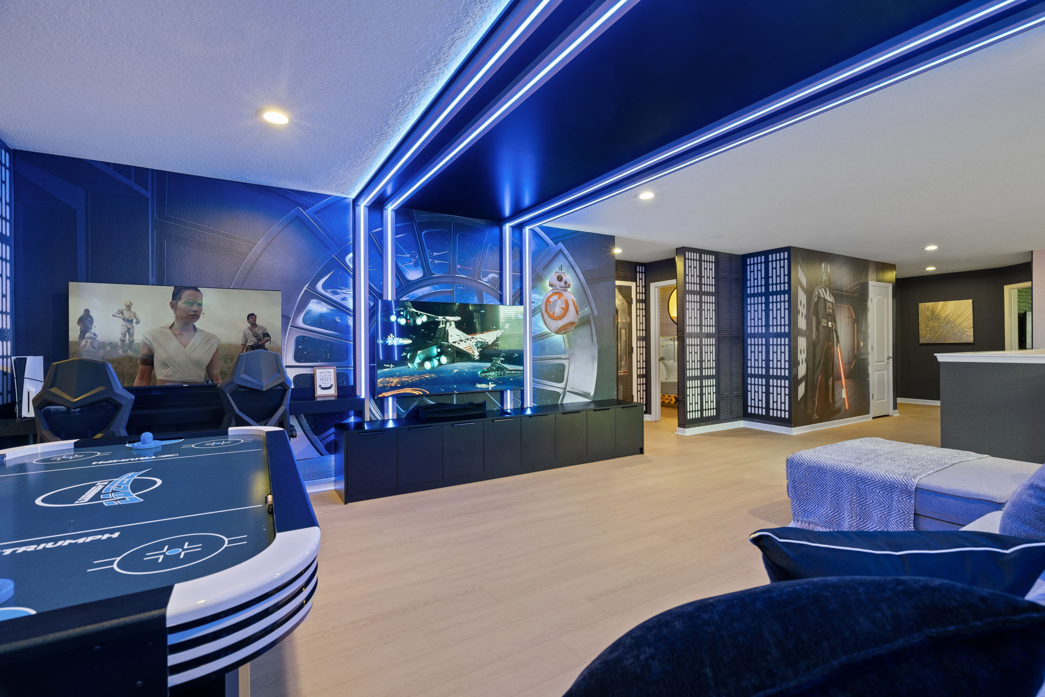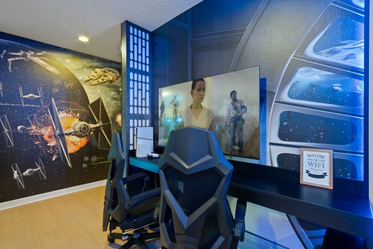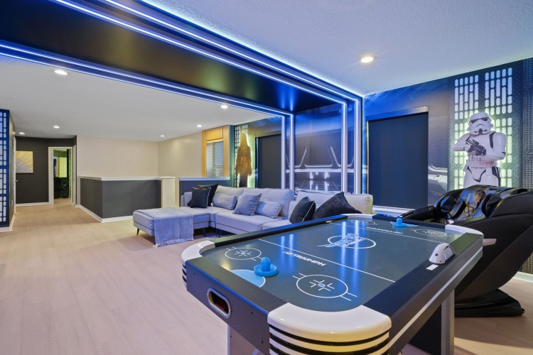 • Loft temático Star Wars com mesa de air hockey, PS5 e espaço para filmes e jogos