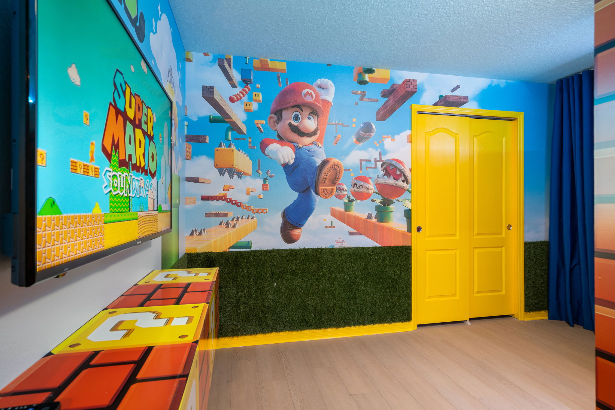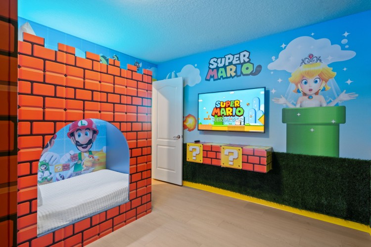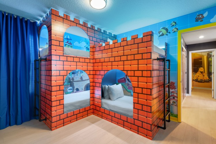 • Quarto temático Mario com duas beliches (configuração: 2 colchões de solteiro 2 colchões infantil)