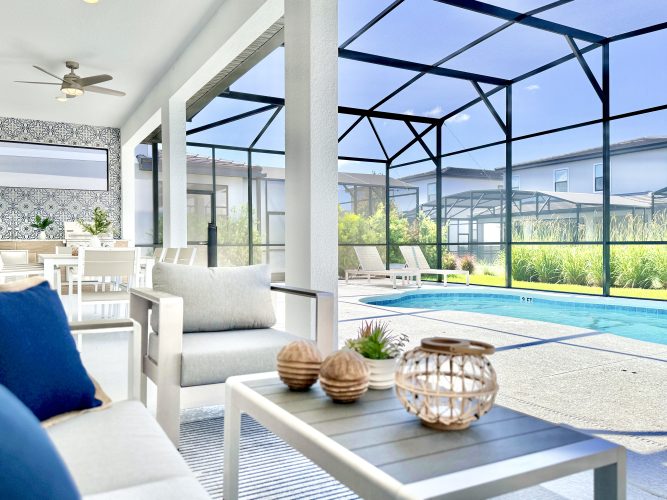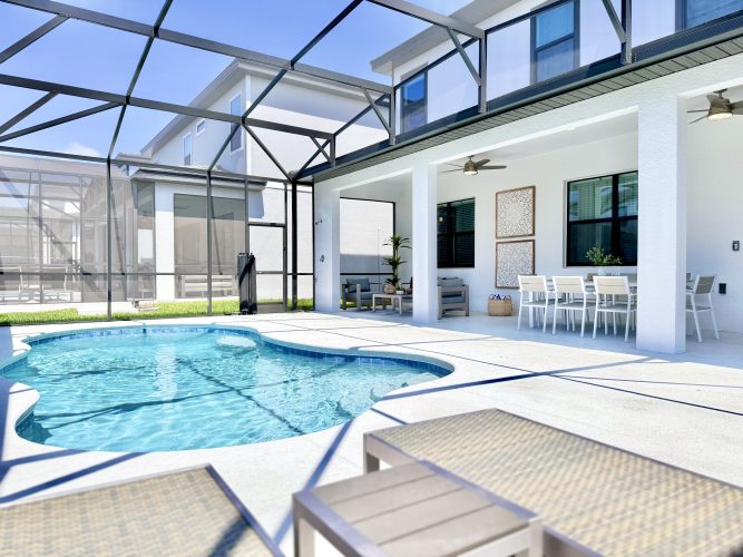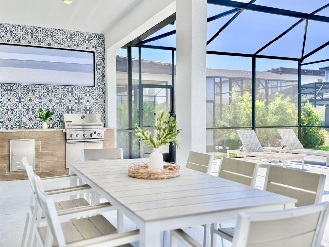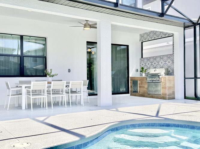 Relaxe nesta espaçosa área de lazer privativa, completa com piscina, Summer Kitchen com churrasqueira e uma área de jantar convidativa. Perfeito para aproveitar o sol da Flórida.