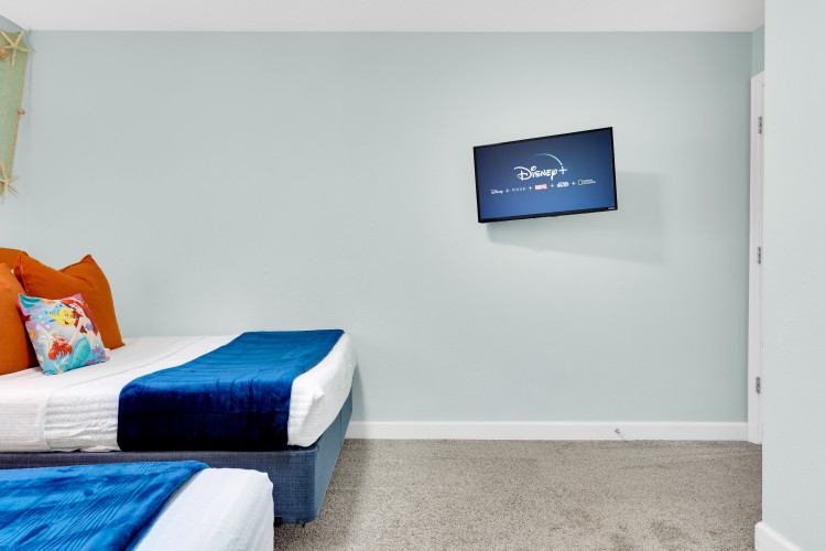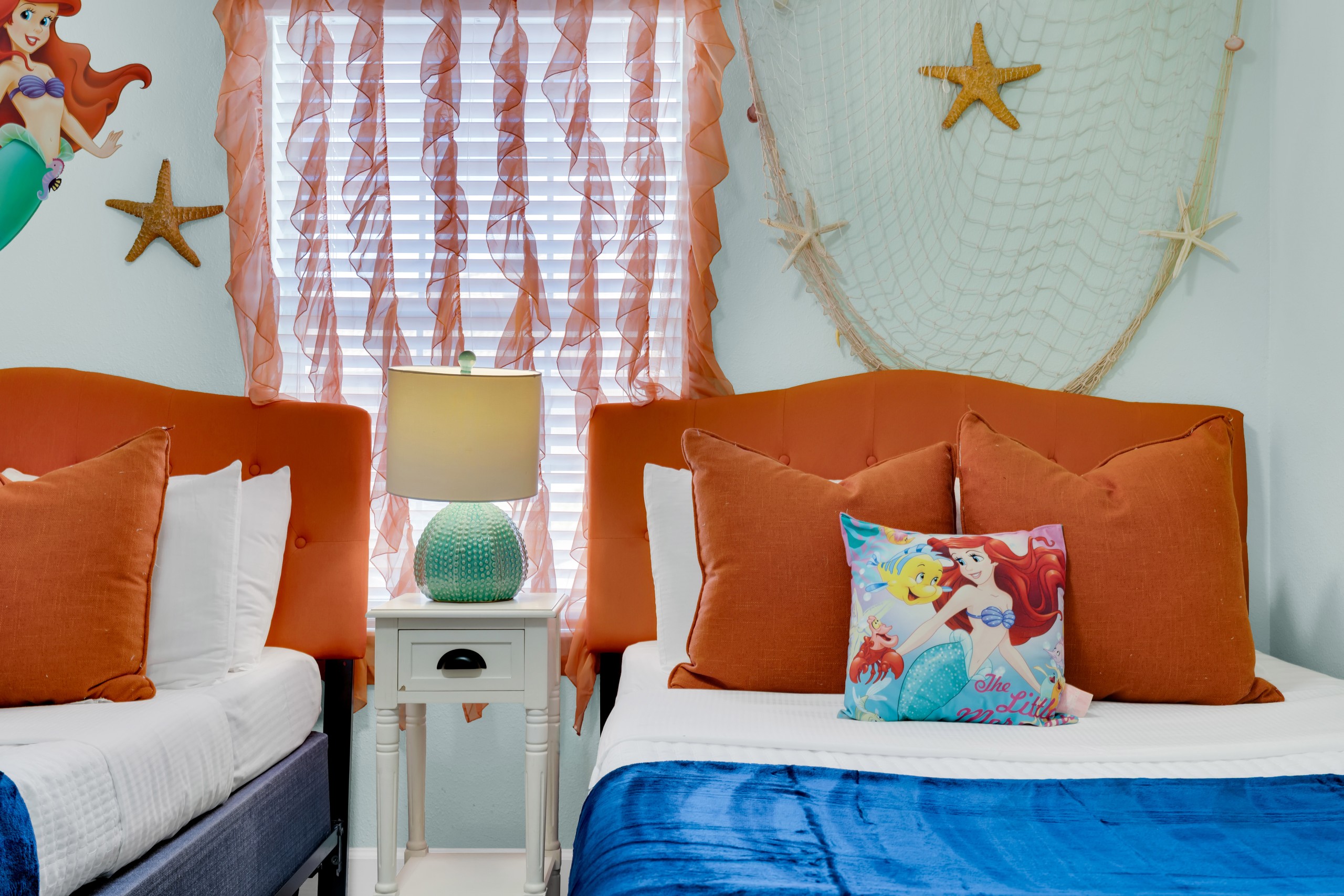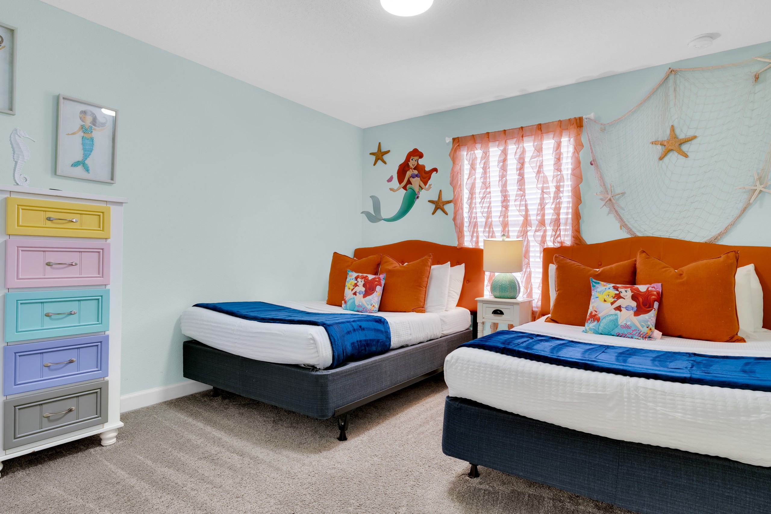 • Quarto temático da Pequena Sereia com duas camas de casal e TV Vizio 42″