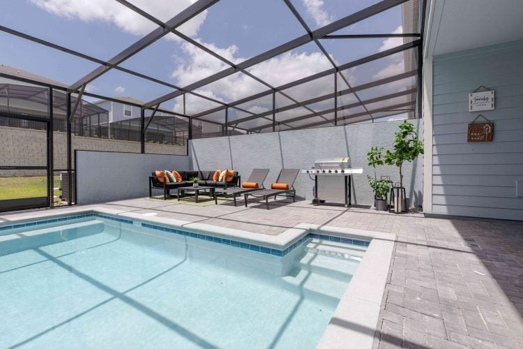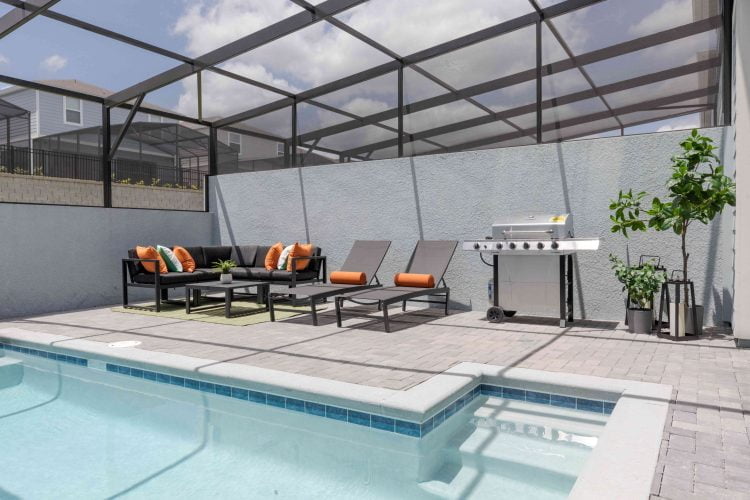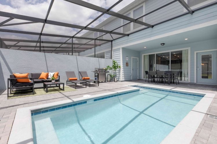 Piscina privativa e churrasqueira ao ar livre.