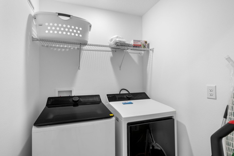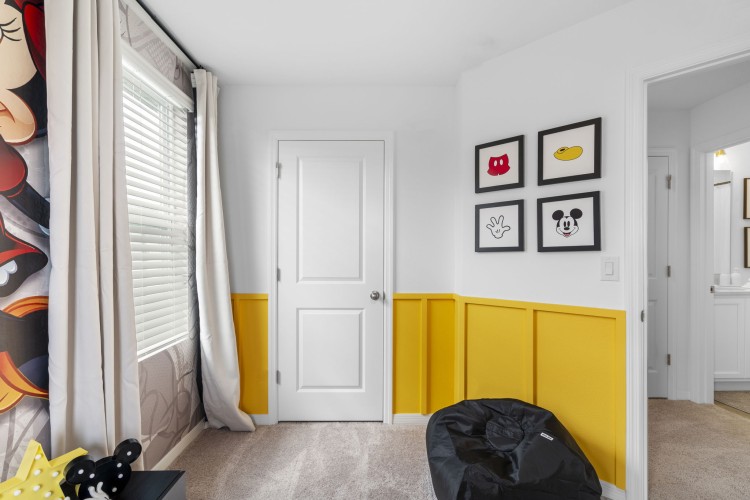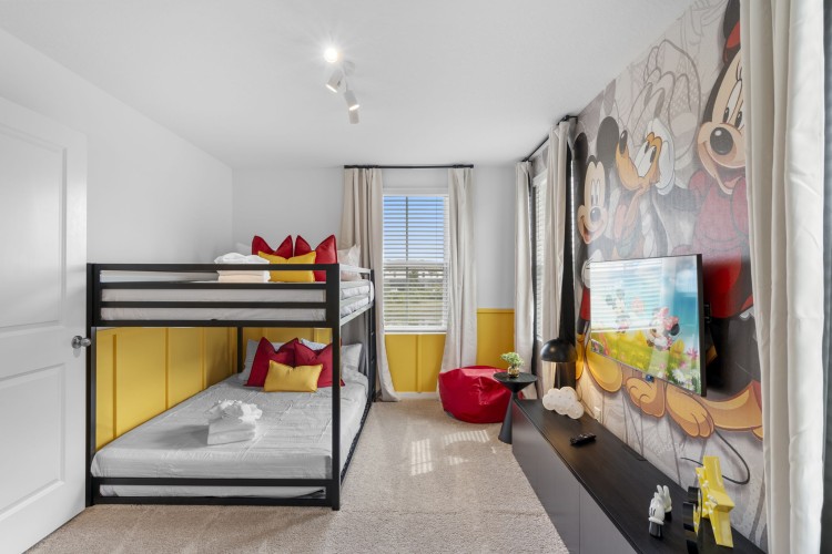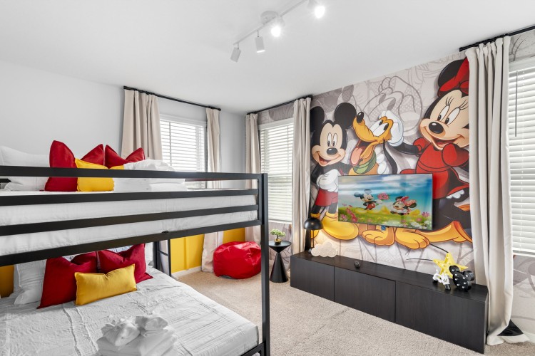 No segundo andar, você encontrará uma suíte master com cama king-size, um quarto com cama queen-size e um divertido quarto temático com beliche de camas full, decorado com Mickey, Minnie e Pluto. Para sua conveniência, há também um banheiro completo e uma lavanderia equipada com lavadora e secadora.