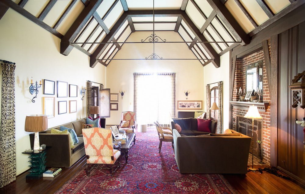 A sala de estar conta com um teto com vigas de madeira, ferro forjado, janelas de vidro e uma varanda no estilo Julieta.