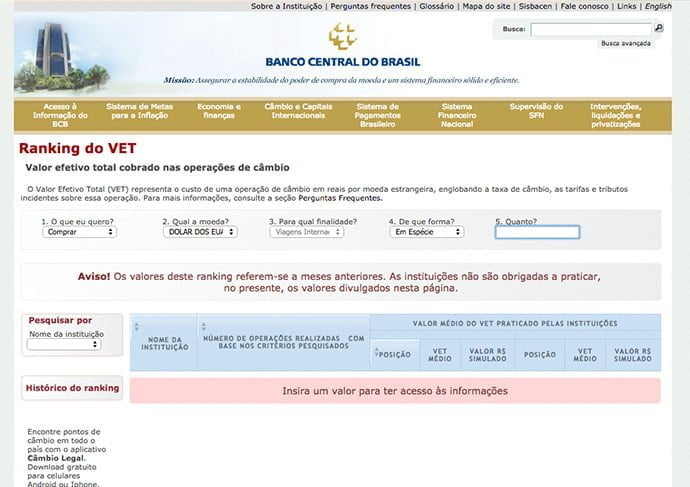 A ferramenta se chama Ranking do VET, quem além de mostrar o custo da moeda é possível ver tarifas e o Imposto sobre Operações Financeiras (IOF).
