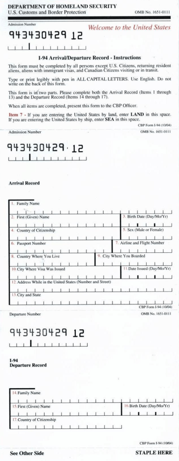 Todo turista, que visita os EUA conhece o formulário I-94. É o formulário que você recebe durante seu voo, preenche e entrega junto com seu passaporte na imigração. Após a verificação, o agente destaca o canhoto, grampeia-o no seu passaporte e quando da viagem de volta você o entrega ao funcionário da empresa aérea.